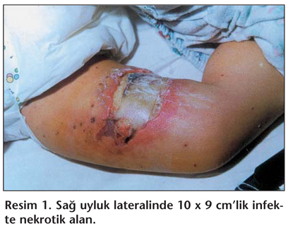 İki yaşında erkek hasta, dört gün önce başlayan su çiçeği döküntülerinin yanı sıra, sağ uyluk ve submandibüler bölgede apseler nedeni ile başvurdu. Döküntülerin üçüncü gününde inatçı kaşıntısı nedeni ile ailesi tarafından eczaneden alınan beklometazon dipropionat içeren pomadın lezyonlara sürüldüğü ve 24 saat içerisinde bu lezyonların genişleyerek nekrotik hal aldığı öğrenildi. Öz ve soygeçmişinde özellik olmayan hastanın fizik muayenesinde ateş 39.8°C, genel durumu orta, huzursuz ve toksik görünümde idi. Tüm vücutta yer yer kurutlu, infekte veziküler ve büllöz lezyonlar ile sağ mandibüler alanda 3.5 x 2 cm'lik, sağ uyluk lateralinde 10 x 9 cm'lik, infekte geniş nekrotik alan izlendi (Resim 1).