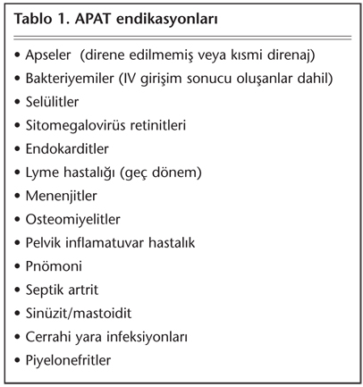 APAT tedavisinin en sık rastlanılan endikasyonları septik artrit ve osteomiyelit tedavisidir. AIDS’in infeksiyöz komplikasyonları da bu programla tedavi edilebilir. Ancak mümkün olan en kısa zamanda parenteral tedavi, yeni ve etkin oral antibiyotikler ile değiştirilmelidir. Gram negatif mikroorganizmalara bağlı osteomiyelitler ve üriner sistem infeksiyonları oral antimikrobiyal ajanlarla (örneğin; kinolon grubu) tedavi edilebilir[3-5].
