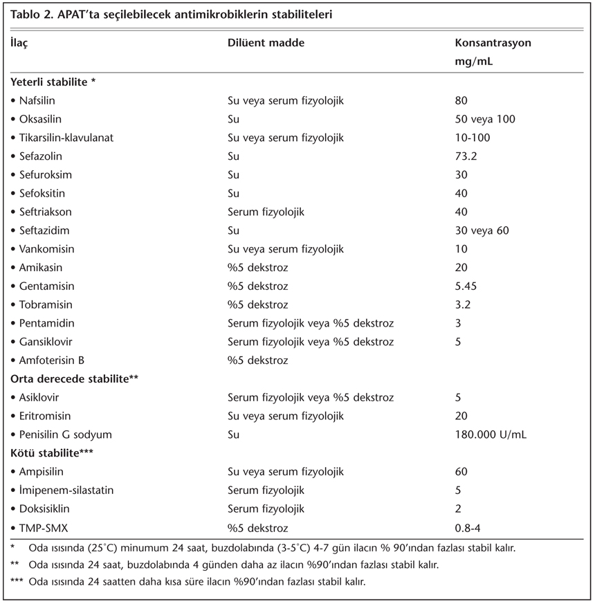 Seçilen antibiyotiğin pompa sistemlerinde stabilite süresi bilinmelidir. Bir çok antibiyotik için bu süre, oda ısısında 12 saat ve altındadır. Tablo 2’de sık kullanılan antimikrobiyal ajanların stabiliteleri görülmektedir[1].