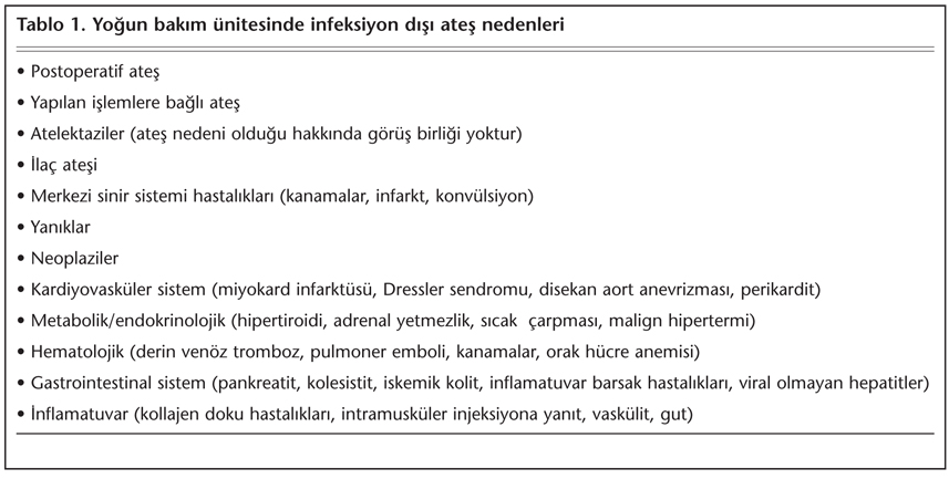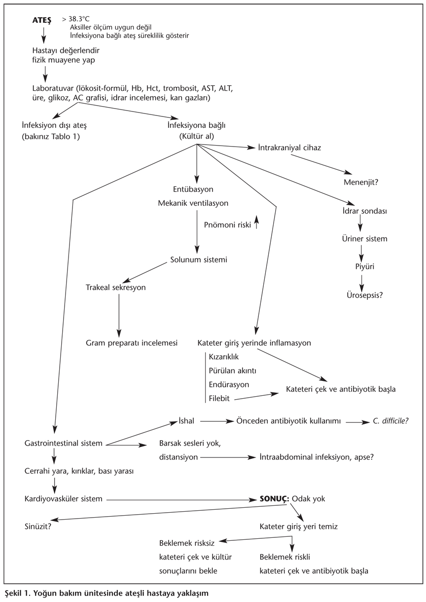 Yoğun bakım ünitesinde hastanın ateşinin yükselmesi infeksiyon hastalıkları konsültasyonu istemek için ilk sırada yer alan bir nedendir. Ateş tanımı için vücut ısısı eşik değeri 38-38.3°C arasında değişmektedir. Yoğun bakım ünitesinde genel olarak kabul edilen eşik değer 38.3°C’dir ve koltuk altı yolu ile vücut ısısı ölçülmesi gövde (core) ısısı ile ilişki göstermemesinden dolayı tavsiye edilmez. Ateşi olan bir hasta ile karşılaşıldığında ateşin infeksiyon dışı nedenlere bağlı olabileceği de düşünülmekle birlikte öncelikle infeksiyon odağı aranmalıdır, çünkü tedavi edilmeyen infeksiyon hastalığının klinik tablosu ve seyri ağırlaşır. Şekil 1’de ateşli hastaya yaklaşım gösterilmiştir. İnfeksiyon ortaya konmadan, hastanın durumunda herhangi bir bozulma olmadıkça antibiyotik kullanılmamalıdır. İnfeksiyon dışı ateş nedenlerinin de farkında olunması uygunsuz antibiyotik kullanımını önleyecektir. Her ne kadar en sık konsültasyon istenme nedeni ateş olsa da, infeksiyonu olan bazı hastalarda ateş olmayabileceği de gözden kaçırılmamalıdır. Böyle hastalarda vücut sıcaklığı normal veya hipotermik olabilir. Bu durum özellikle yaşlı, açık batın yarası veya geniş yanığı olan, antiinflamatuvar veya antipiretik kullanan, hemodiyaliz uygulanan, ekstrakorporal membran oksijenizasyonu yapılan hastalarda dikkatle değerlendirilmelidir. Hipotansiyon, taşikardi, taşipne, mental konfüzyon, titreme, deri lezyonları, solunum sıkıntısı, oligüri, laktik asidoz, lökositoz, lökopeni veya trombositopeni gibi belirti ve bulgular eğer infeksiyon dışı bir nedene bağlanamıyor veya açıklanamıyorsa, olası bir infeksiyon açısından dikkatle üzerinde durulmalıdır. Ateşin amplitüdü, süresi, nabızla ilişkisi, yapılan tanı ve tedavi girişimleri ile ilişkisi yoğun bakım ünitesinde ateşin değerlendirilmesinde yardımcı olacaktır. Tedavisiz kendiliğinden düşen bir ateş genellikle klinik olarak anlam taşımaz ve o sırada hastaya yapılan endotrakeal aspirasyon, yara bakımı, idrar sondası bakımı gibi geçici olarak bakteremi oluşturan işlemlere bağlı olabilir. İnfeksiyon dışı nedenlere bağlı ateş ile karşılaştırıldığında infeksiyona bağlı ateş devamlılık gösterir. Postoperatif dönemdeki hastalarda sıklıkla ateş saptanır, ancak ateş kaynağı olarak infeksiyon saptanamaz. İlk iki gündeki ateş sıklıkla infeksiyon dışıdır. Atelektaziler post-operatif dönemde ateşe yol açabilirler. Genellikle operasyondan 4 gün sonrasında çıkan ateş infeksiyona bağlıdır. Ateş amplitüdü ile genel durum arasındaki uygunsuzluk, rölatif bradikardi, döküntü ve eozinofili varlığında ilaç ateşi mutlaka düşünülmelidir. Tablo 1’de yoğun bakım ünitesinde infeksiyon dışı ateş nedenleri görülmektedir[9-11].