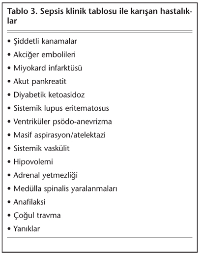 Yoğun bakım ünitesinde sistemik inflamatuvar yanıt sendromuna yol açarak sepsis ile karışabilecek birçok hastalık bulunmakla birlikte öncelikle bu klinik tablonun infeksiyona bağlı olabileceği olasılığı dikkatle değerlendirilmelidir (Tablo 3).