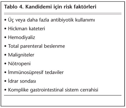 Kandidemi gelişimine zemin hazırlayan birçok risk faktörünü de yoğun bakım hastalarında sıklıkla saptayabiliriz (Tablo 4). Özellikle hematojen kandidiyaz için karakteristik bir klinik tablonun olmaması nedeniyle endoftalmit, süpüratif filebit veya idrar sondası yokluğunda kandidüri bu yönden uyarıcı olmalıdır[28,29].