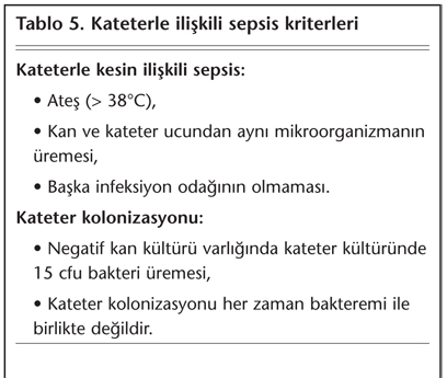 İntravasküler kateterler lokal olarak kateter giriş yerinde infeksiyon, sistemik infeksiyon veya allerjik reaksiyona neden olarak ateşe yol açabilir. Fizik muayenede kateter giriş yeri mutlaka gözden geçirilmeli ve eritem, endürasyon, pürülan akıntı ve hassasiyet varlığı değerlendirilmelidir. Kateter giriş yerindeki pürülan akıntı veya eksüda, Gram boyama ile incelenmeli ve kültür yapılmalıdır. Buradaki inflamasyonun irritasyona bağlı olabileceği de unutulmamalıdır. Kateterle ilişkisi kesin olarak saptanmış sepsiste kateter giriş yerinde inflamasyon olmayabilir. Kateterle ilişkili sepsis düşünülen olgularda kateter ve periferden olmak üzere iki kan kültürü alınmalıdır. Kateter ucunun kalitatif kültürünün doğruluk değeri oldukça azdır. Tanı için Maki’nin yarı kantitatif yöntemi ile kateter ucunun kültürü (maliyet-yarar en uygun yöntem) veya kateter ucunun kantitatif sıvı kültürü (doğruluk değeri oldukça yüksek) yapılmalıdır. Gram boyama sadece kateterin dışındaki mikroorganizmayı gösterir. Uzun süre kalan kateterlerde mikroorganizmanın sıklıkla kateter içinde bulunacağı unutulmamalıdır. Böyle durumlarda kantitatif sıvı kültürü veya kantitatif periferik/santral kan kültürleri tanıda yararlıdır. Aynı anda periferik olarak ve kateterden alınan kan kültürlerinde, üremenin kateterden alınan kan kültüründe daha erken olması kateterle ilişkili sepsis lehinedir. Epidemiler dışında, verilen sıvının kültürünün yapılmasına gerek yoktur. Kateter ucunda Staphylococcus aureus, Pseudomonas aeruginosa veya Candida spp. üremesi %37-57 oranında kateterle ilişkili bakteremi riski taşır. Ani yükselen ateş (> 38.5°C) ve titreme diğer infeksiyonlara göre daha sıktır. Kateter giriş yerinde inflamasyon, ateş, emboli veya sepsis varlığında kateter çekilmeli ve gerekiyorsa yeni bir kateter başka bir giriş yerinden takılmalıdır. Ateşli bir hastada kateter giriş yeri temiz ve başka infeksiyon odağı yoksa kateter çıkarılır ve durumu stabil olmayan hastada antibiyotik tedavisi başlanır. Kateterle kesin ilişkili sepsis ve kateter kolonizasyonu kriterleri Tablo 5’te gösterilmiştir[9,11,30-32].