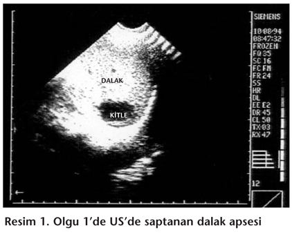 Dalak apselerinin tanısında en büyük ilerleme modern, noninvaziv görüntüleme yöntemlerinin bulunmasından sonra ortaya çıkmıştır. US %76, BT ise %96 duyarlılıkla tanı konulmasını sağlar. US'de apseler hipoekoik görünmektedirler. US ucuz, noninvaziv ve solid lezyonları kistik lezyonlardan ayıran iyi bir tanı aracıdır[2,3,5,8]. Olgularımızın ikisinde de tanı US ile konuldu. Dalak apsesi olan olgularda; PA akciğer grafisinde pulmoner ödem, pulmoner infiltrasyon, solda pulmoner efüzyon, sol hemidiyafragmada yükselme gibi bulgular izlenebilmektedir[8]. Olgularımızın PA akciğer grafileri normal olarak değerlendirildi.