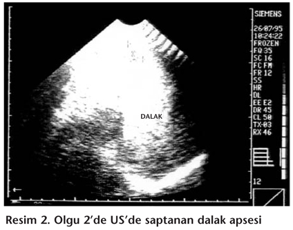 Ondört yaşında kadın hasta 10 gün önce başlayan ateş ve ishal yakınmalarıyla başvurdu. Fizik muayenede ateş: 40°C, nabız: 80/dakika, kan basıncı: 100/70 mmHg idi. Hastanın bilinci açık ve koopereydi. Oskültasyonda mitral odakta 2/6° sistolik üfürüm duyuldu. Dalak orta klavikula çizgisinde 2-3 cm ele geliyordu. Karın derisinde 7-8 adet makülopapüler döküntü görüldü. Diğer sistem muayeneleri normaldi. Laboratuar incelemede; lökosit: 4300/mm3 (%68 PNL, %30 lenfosit, %2 monosit), Hb: 11.8 g/dL, Hct: %36, trombosit: 80.000/mm3, SGOT: 324 U/L, SGPT: 122 U/L saptandı. PA akciğer grafisi normaldi. Ekokardiyografisi normal olarak değerlendirildi. Widal aglütinasyon testinde TO: 1/400, TH: 1/200, PBO: 1/50, PBH: Negatif, PAH: Negatif bulundu. Kan kültüründe S. typhi üredi. Disk difüzyon yöntemiyle yapılan antibiyotik duyarlılık testinde ampisilin, sulbaktam-ampisilin, tetrasiklin, kloramfenikol, seftriakson, siprofloksasin, ofloksasin, trimetoprim-sulfametoksazol duyarlı bulundu. Dışkı kültüründe Salmonella-Shigella cinsi bakteri üremedi. İdrar kültüründe üreme olmadı. Boğaz kültüründe normal boğaz florası üredi. Hastaya kloramfenikol 4 x 500 mg PO başlandı. Kloramfenikol tedavisinin 4. gününde ishali kesildi ve 5. gününde ateş normale döndü. Tedavinin 4. gününde yapılan karın US'de minimal splenomegali saptandı. Hasta tedavinin 11. gününde tedavisini 14 güne tamamlamak üzere taburcu edildi. İlk US'yi izleyen, 15 gün sonra yapılan kontrol karın US'de dalak üst polde, yüzeye yakın kesimde bir adet 26 mm çaplı hipoekoik apseyle uyumlu kitle izlendiği bildirildi (Resim 2). Hasta zaman zaman sol hipokondriumda şiddetli ağrıdan yakınıyordu. Kloramfenikol tedavisini 14 güne tamamladıktan sonra kesmiş olan hastaya siprofloksasin 2 x 500 mg PO başlanarak, US takipleri planlandı. Tedavinin 14. gününde dalaktaki apsenin 20 mm'ye gerilediği, 4. haftada ise görüntülenemediği bildirildi. Tedavi 30. günde sonlandırıldı. Tedavinin sonlandırılmasından sonra 15. ve 30. günlerde yapılan batın US normal olarak değerlendirildi. Bu dönemde hastanın herhangi bir yakınması bulunmamaktaydı.