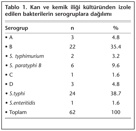 Çalışma grubunu 14-62 yaşları arasındaki yaş ortalamaları 23.67 ± 7.27 olan 34 erkek; yaş ortalamaları 26.22 ± 15.77 olan 28 kadın olmak üzere toplam 62 hasta oluşturdu. Bu olguların kan ve kemik iliği kültürlerinde izole edilen bakterilerin serogruplara dağılımı Tablo 1'de görülmektedir.