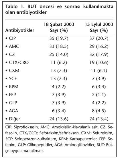 Çalışmanın yapıldığı ilk gün olan 18 Şubat 2003 tarihinde ziyaret edilen 17 klinikte yatan toplam hasta sayısı 856 idi ve bunlardan 178 (%20.8)'i sistemik antibiyotik kullanmaktaydı. İkinci ziyaret günü olan 15 Eylül 2003 tarihinde ise 17 klinikte yatmakta olan hasta sayısı 857, sistemik antibiyotik kullanan hasta sayısı 179 (%20.8)'du. Her iki tarihte hastanede kullanılmakta olan antibiyotikler Tablo 1'de belirtilmiştir.