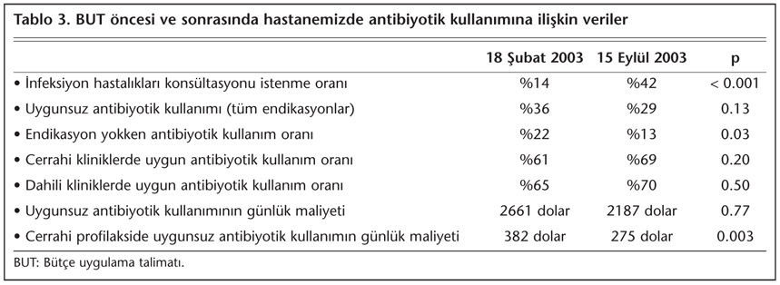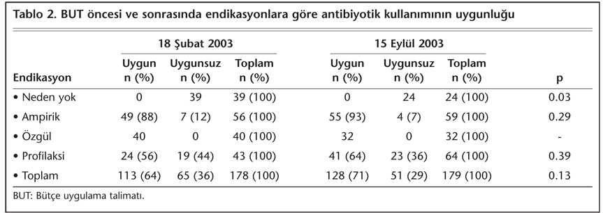 Hastanemizde uygunsuz antibiyotik kullanımında BUT sonrasında, istatistiksel olarak anlamlı olmamakla birlikte bir azalma (%36'dan %29'a) olmuştur. Bu azalmada endikasyonsuz antibiyotik kullanımındaki belirgin düşüş etkili olmuş olabilir. Tünger ve Erbay, endikasyon yokken antibiyotik kullanılmasının en önemli uygunsuzluk nedeni olduğunu belirtmişlerdir[11,14]. Bizim çalışmamızda da uygunsuz antibiyotik kullanımının, 18 Şubat 2003'te %60'ı, 15 Eylül 2003'te ise %47'si endikasyon yokken antibiyotik kullanımına bağlıydı ve iki tarih arasındaki azalma anlamlı idi (p= 0.03). Bu azalmaya rağmen BUT sonrasında uygunsuz antibiyotik kullanımındaki düşüşün anlamlı bulunmamasının nedeni, araştırmamızın tek bir gündeki antibiyotik kullanımını içermesi ve bu yüzden hasta sayısının az olması olabilir. Bir diğer neden de, 18 Şubat 2003'te antibiyotik kullanımının %25'ini oluşturan ve uygunsuzluk oranı yüksek bir uygulama olan cerrahi profilaksinin 15 Eylül 2003'teki oranının %35 olmasıdır.