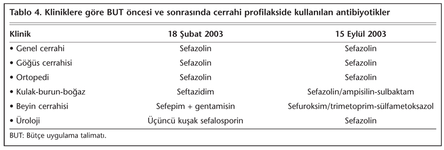 Uygunsuz antibiyotik kullanımının en önemli nedeninin cerrahi profilakside yapılan yanlışlar olduğu belirtilmektedir. Erol ve arkadaşlarının yapmış olduğu çalışmada, uygunsuz kullanımın %68'i cerrahi profilaksiden kaynaklanırken, Baharlı ve arkadaşları, hastanelerinde cerrahi profilaksi uygulamasının %80'inin uygunsuz olduğunu bildirmiştir[12,13]. Her iki yazar da profilaktik uygulamadaki hatanın, antibiyotiklerin uygun olmayan doz ve/veya süre kullanılmasından kaynaklandığını belirtmektedir. Bizim çalışmamızda cerrahi kliniklerdeki antibiyotik kullanımının, Şubat ayında %32'sini, Eylül ayında %62'sini cerrahi profilaksi amaçlı kullanım oluşturmaktaydı. Cerrahi profilaksi için antibiyotik kullanımında uygunsuzluk oranı her iki tarihte de ampirik kullanıma göre daha yüksekti (Tablo 2). Uygunsuzluğun en önemli nedeni, Şubat 2003'te uygun olmayan antibiyotik ile profilaksi yapılmasıydı. Eylül 2003'te doğru antibiyotiklerin seçildiği, ancak uygun olmayan doz ve/veya süre kullanıldıkları görüldü. BUT'un uygulamaya girmesiyle birlikte kliniğimiz öğretim üyelerince cerrahi kliniklerde düzenlenen bilgilendirme toplantıları sonucunda, cerrahi profilakside doğru antibiyotik seçiminin arttığı, ancak doz ve süre konusunda beklenen düzeyde bir düzelme sağlanamadığı görüldü (Tablo 4). BUT sonrasında, cerrahi profilakside uygun kullanım oranı artmasa da, uygun olmayan cerrahi profilaksi nedeniyle ortaya çıkan maliyette anlamlı bir azalma görüldü. 18 Şubat 2003'te uygunsuz cerrahi profilaksinin günlük maliyeti 382 dolar iken, 15 Eylül 2003'te 275 dolar idi (p= 0.003). Cerrahi profilakside yaşanan sorunlara rağmen çalışmamızda, diğer çalışmaların aksine, dahili ve cerrahi servisler arasında uygunsuz antibiyotik kullanımı açısından farklılık yoktu.