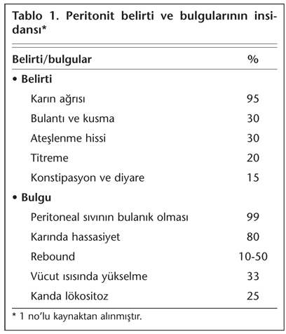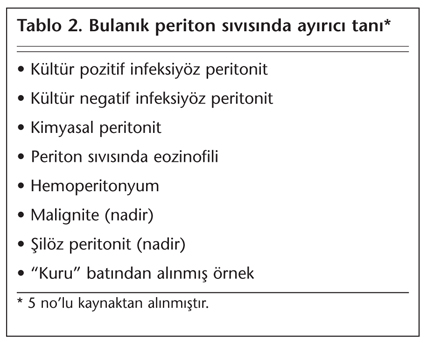Hastalarda periton sıvısında bulanıklaşma, karın ağrısı ve/veya ateş en sık saptanan bulgulardır (Tablo 1). Ancak karın ağrısının olmayabileceği ya da periton sıvısının berrak olabileceği akılda tutulmalıdır. Ayrıca, bulanık periton sıvısı her zaman peritonit anlamına gelmediğinden ayırıcı tanının yapılması gerekmektedir (Tablo 2). CAPD peritonit tanısı için aşağıdaki durumlardan en az ikisinin olması gerekmektedir[5]:
