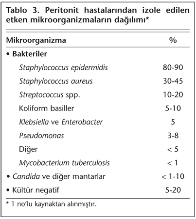 CAPD peritonit etkeni olan mikroorganizmaların büyük bölümünü gram-pozitif mikroorganizmalar oluşturmaktadır[6,7]. Son yıllarda CAPD tekniklerindeki gelişmeler ile KNS'de anlamlı azalma sağlanmıştır. Ancak S. aureus'a bağlı gelişen ataklarda azalma gözlenmemiştir[2,7]. Son yıllarda yapılan çalışmalarda CAPD etkeni olan stafilokoklarda yıllar içerisinde metisilin direncinde anlamlı bir artış olduğu belirtilmektedir[7,8]. Metisiline dirençli suşlarla gelişen peritonit olgularında kateter çekilme oranının daha yüksek olduğu gözlenmiştir[7]. Anaerop ve birden fazla gram-negatif bakterinin etken olduğu durumlarda bağırsak perforasyonu akla gelmelidir. Gram-negatiflere bağlı gelişen peritonitlerde kateterin çekilme ve ölüm oranları gram-pozitif mikroorganizmalarla gelişenlere göre daha yüksek bulunmuştur[7]. Fungal peritonit %3-10 oranında görülmekte ve büyük kısmında (%75-80) Candida spp. etken olarak izole edilmektedir. Mikroorganizmalar peritona bağlantı yerlerinden, kateter çevresinden, bağırsak duvarından, hematojen yolla ve vajenden ulaşabilir[9]. CAPD etkeni olan mikroorganizmaların dağılımı Tablo 3'te verilmiştir.