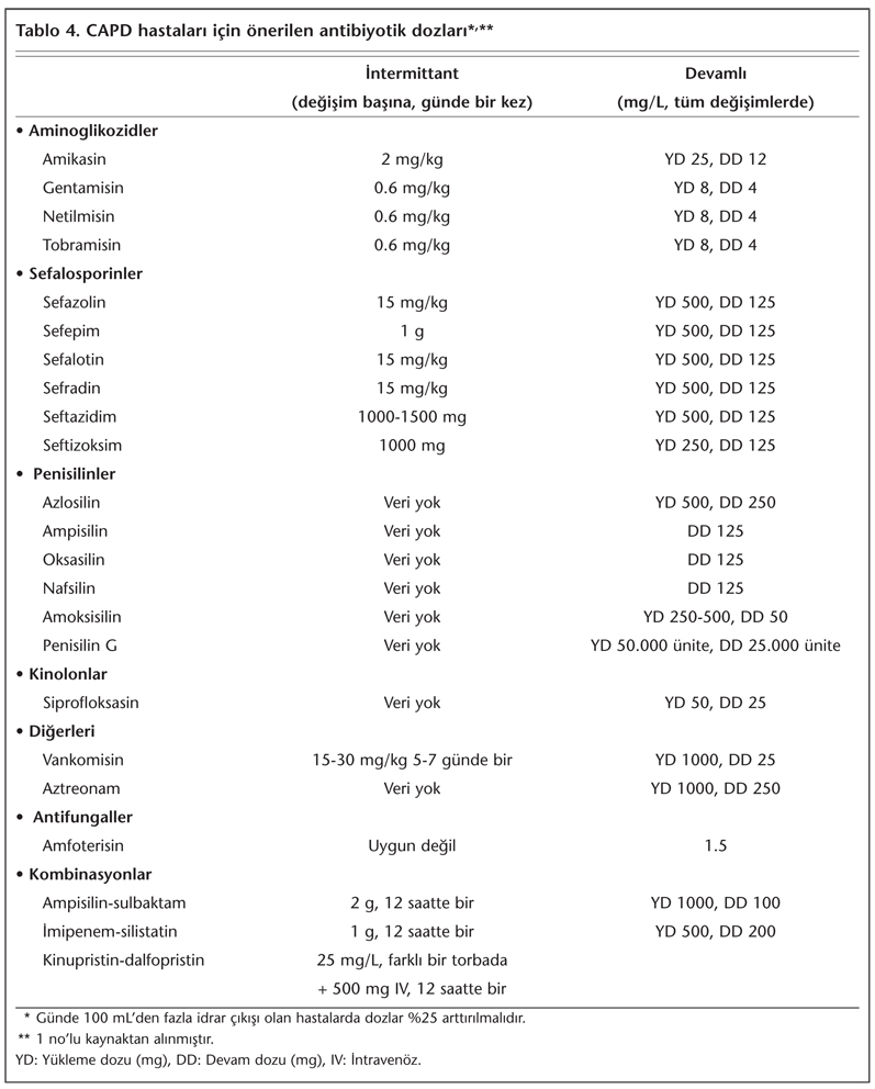 Antibiyotiklerin uygulanmasında intraperitoneal yolun tercih edilmesi önerilmektedir. Bu uygulama ile yüksek lokal antibiyotik konsantrasyonu sağlanmakta, venöz yol gereksinimi ortadan kalkmakta ve hasta tarafından uygulanabilir bir tedavi haline gelmektedir. Antibiyotikler diyaliz solüsyonuna steriliteye dikkat edilerek ayrı enjektörlerle eklenmelidir. Sefolosporinler, vankomisin ve aminoglikozidlerin (AGA) aynı diyaliz solüsyonunda etkinliğini kaybetmeden karıştırılabileceği belirtilmektedir[5]. Antibiyotikler her değişimde sürekli ya da günde bir kez aralıklı (intermittant) verilebilir. Sistemik dolaşıma antibiyotik absorpsiyonunun sağlanabilmesi için torba değişim süresi en az altı saat olmalıdır. Peritonitte bir çok antibiyotiğin absorpsiyonu artmaktadır. Peritonit tedavisi için intermittant ve sürekli uygulanacak olan intraperitoneal antibiyotik dozları ISPD tarafından belirlenmiştir[5] (Tablo 4). Etken mikroorganizmanın türü ve duyarlılığı belli olduktan sonra tedavi bu sonuçlara göre düzenlenmelidir.