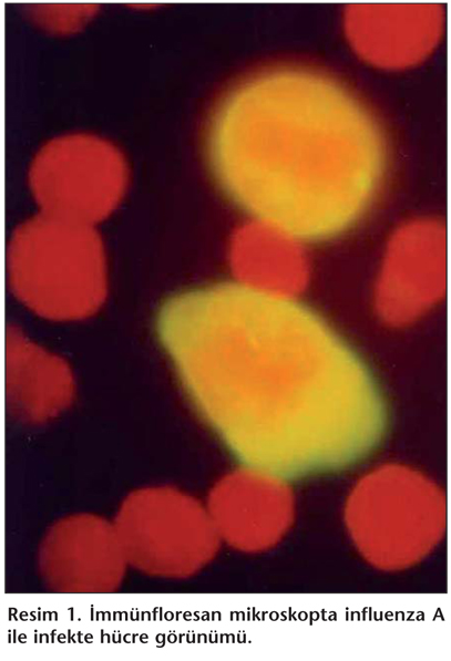 Grip; öksürük, burun akıntısı, boğaz ağrısı gibi solunum sistemi semptomları ile birlikte ani başlangıçlı ateş, baş ağrısı, halsizlik ve kas ağrılarıyla seyreden, solunum yolları mukozasının inflamasyonu ile karakterize influenza virüslerinin neden olduğu son derece bulaşıcı bir infeksiyon hastalığıdır[1,2]. Özellikle son yıllarda bu hastalığın gelişmiş ülke ekonomilerini etkileyecek biçimde iş gücü kaybına yol açtığının belirlenmesi, hastalıktan korunmada etkili bir aşının varlığı ve tedavi amaçlı olarak çeşitli antiviral ajanların kullanıma girmesi, zaman zaman epidemi ve pandemilere yol açan ve risk gruplarında yüksek mortalite oranları olan bu hastalığın önemini artırmıştır[2,3]. Hastalık çoğunlukla kış aylarında görülürken, insanlar arası direkt temas, damlacık yolu ve kontamine eşyalar yoluyla bulaşır. Klinik asemptomatik seyirli olabileceği gibi, ölümcül seyreden bir viral pnömoni tablosu da görülebilmektedir[1,2]. Bu semptomlara başta influenza virüsleri olmak üzere birçok virüs [respiratuar sinsityal virüs "respiratory syncytial virüs (RSV)", parainfluenza virüs, adenovirüs, rinovirüs, koronavirüs gibi], bakteri, fungus ve paraziter etkenler neden olabilmektedir[4]. Bu nedenle viral infeksiyonlarda ayırıcı tanı önem kazanmaktadır. Klinik olarak ayrımı zor olan bu etkenlerin ayırıcı tanısı ancak seroepidemiyolojik incelemelerle yapılabilmektedir. İmmünfloresan yöntemle viral antijen ve antikorların saptanması bu etkenlerin serolojik olarak ayırt edilmesinde önemlidir.