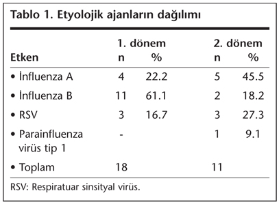 Amerika Birleşik Devletleri'nde 2000-2001 döneminde incelenen 88.598 örneğin %10'unda etken tespit edilmiş; bunların %54'ü influenza A, %46'sı influenza B olarak belirlenmiştir[11]. Rabagliati ve arkadaşlarının çalışmasında, 86 hastada %48.2 influenza A, %25.3 influenza B, %15.7 parainfluenza-2, %8.4 RSV, %1.2 parainfluenza-3 ve %1.2 adenovirüs tespit edilmiştir[4]. 2000-2001 influenza mevsiminde İstanbul Üniversitesi İstanbul Tıp Fakültesinde, ülkemizdeki toplam beş merkezden sağlanan ve grip tanısı konan 92 örnekten izole edilen 78 suşun %63.9'unda influenza A, %36.1'inde influenza B saptanmış, altı örnekte ise etken tespit edilememiştir[12]. Refik Saydam Hıfzıssıhha Merkezinde 2002-2003 influenza mevsiminde yapılan çalışmada, hücre kültürü pozitif olan 22 örneğin %72'sinde RSV, %14'ünde influenza B, %9'unda influenza A ve %5'inde adenovirüs saptanmıştır[13]. Uyar ve arkadaşları çalışmaya aldıkları örneklerin %28.2'sinde etyolojik ajan tespit etmişlerdir. Bunların %40'ı RSV, %28.6'sı parainfluenza virüsler, %11.4'ü influenza B, %8.6'sı koronavirüs, %5.7'si influenza A ve %5.7'si de adenovirüs idi[14]. Çalışmamızda olduğu gibi, yukarıda belirtmiş olduğumuz çalışmalarda da baskın influenza virüs tipi yıldan yıla ve bölgesel olarak değişiklik göstermektedir.