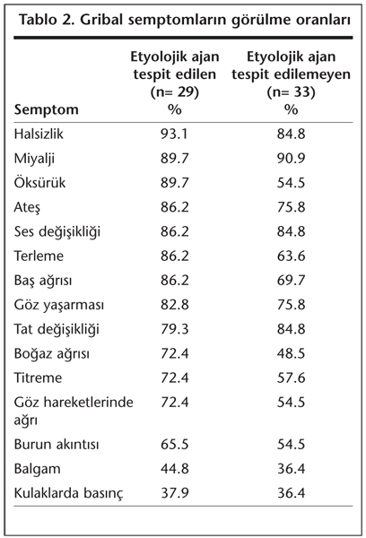 Çalışma dönemlerinde etyolojik ajanın tespit edildiği 29 hasta değerlendirildiğinde; lökosit değerleri ortalama 6813 ± 4917 iken, periferik yaymada 27 (%93.1) hastada lenfosit hakimiyeti mevcuttu. On bir (%37.9) hasta hastaneye yatırılarak izlenirken, üç hastada sekonder bakteriyel pnömoni gelişti ve antibiyotik tedavisi başlandı. Çalışma dönemlerinde etyolojik ajan tespit edilemeyen 33 hasta değerlendirildiğinde; lökosit değerleri ortalama 7030 ± 4128 iken, periferik yaymada 25 (%75.8) hastada lenfosit hakimiyeti mevcuttu. Beş (%15.2) hasta hastaneye yatırılarak izlenirken, hiçbirinde sekonder bakteriyel infeksiyon gelişmedi ve hiçbirine antibiyotik verilmedi. Hastalarda en fazla karşılaşılan semptomlar halsizlik, ateş, terleme, baş ve kas ağrısı, öksürük, göz yaşarması, ses ve tat değişiklikleriydi (Tablo 2).