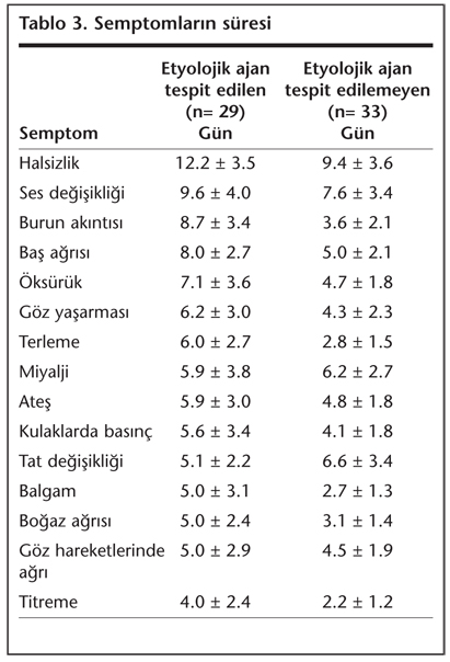 Semptomların devam etme süresi etyolojik ajanın tespit edildiği grupta 6.8 ± 3.1 gün iken, etyolojik ajan tespit edilemeyen grupta 4.6 ± 2.4 gün idi. En uzun süre devam eden semptomlar halsizlik, baş ağrısı, burun akıntısı, ses ve tat değişiklikleriydi (Tablo 3).