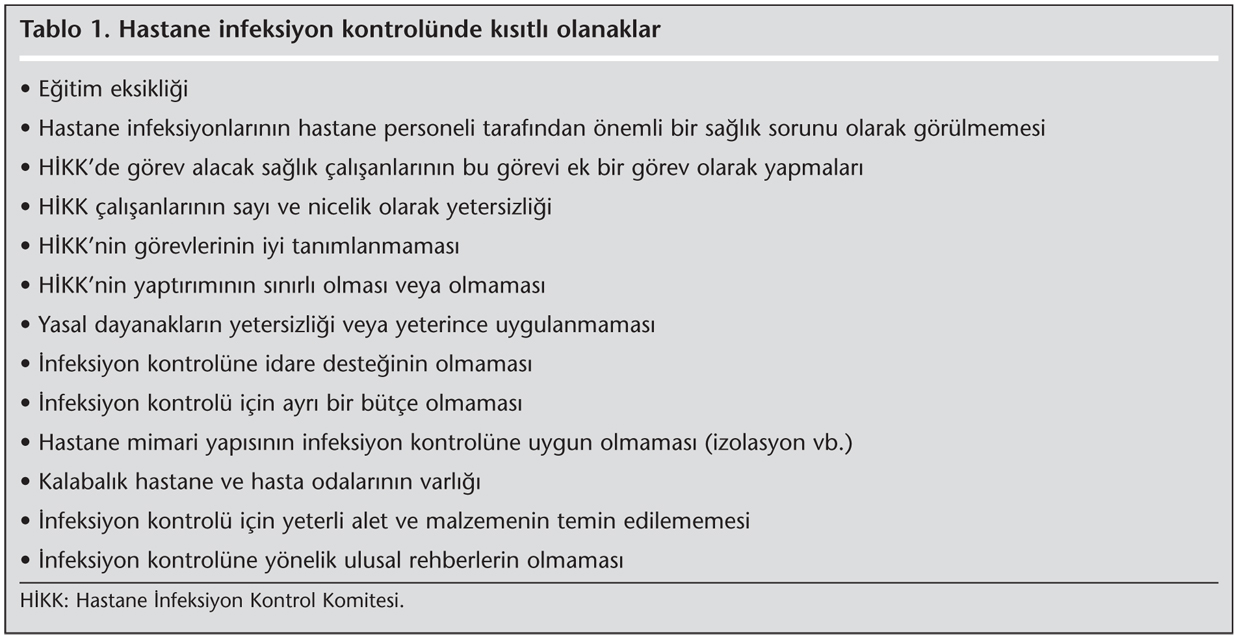 Hastane infeksiyonlarının kontrolü ancak standart yöntemler kullanılarak infeksiyonların izlenmesi ve sorunların saptanarak, uygun infeksiyon kontrol önlemlerinin alınmasıyla mümkündür. Bu amaçla başta hastane infeksiyon kontrol komiteleri (HİKK)’nin oluşturulması olmak üzere iyi bir organizasyon gerekmektedir. Kısıtlı olanaklara sahip ülke ve hastanelerde ise ideal infeksiyon kontrol önlemlerinin alınması güçleşmektedir (Tablo 1)[1,2,3]. Bu yazıda kısıtlı olanağa sahip hastanelerde infeksiyon kontrol önlemlerinin organizasyonu irdelenecektir.