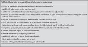 Hastanelerde rasyonel antibiyotik kullanımının sağlanması, antibiyotiklere direnç gelişiminin önlenmesinde yararlıdır. Eğitim programları, antibiyotik direnç sürveyansı, infeksiyon kontrol önlemlerinin sağlanması, antimikrobiyal tedavi ve profilaksi rehberlerinin hazırlanması, antibiyotik kontrol komitelerinin kurulması ve antibiyotik kullanımının kontrol edilmesi direnç ve maliyeti önlemede yararlıdır (Tablo 2)[43,47,48]. Hangi antibiyotiklerin kısıtlı kullanılacağı, hastaların özellikleri, antibiyotik direnç sıklığı ve maliyet gibi faktörler göz önüne alınarak belirlenmelidir. Üçüncü ve dördüncü kuşak sefalosporinler, karbapenemler, glikopeptidler, aminoglikozidler, kinolonlar, sistemik antifungal ve antiviral ilaçların uygun kullanımı sağlanmalıdır.